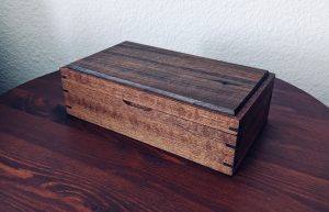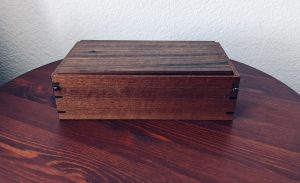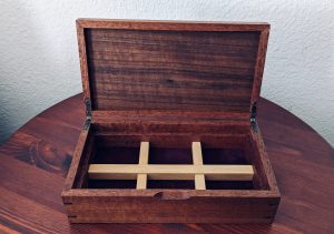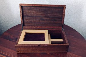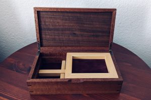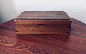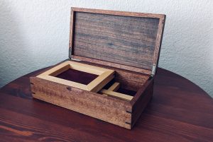 Jewellery box made from mahogany wood for the body and walnut for the top and miter splines. Inside the box I used beech wood for the drawer and dividers. The interior is lined with dark red suede. Used David Freedman’s Box Making Basics book as a reference.