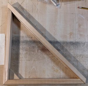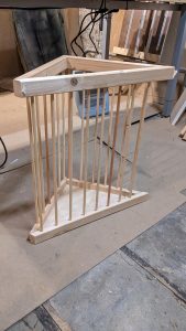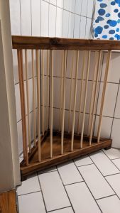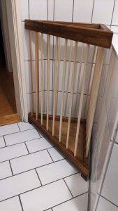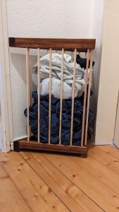 The laundry basket is made mostly from reclaimed pine wood (except the rods). The wood has been stained with oak. The design is unique to the layout of our flat but can fit in most corners anywhere.
